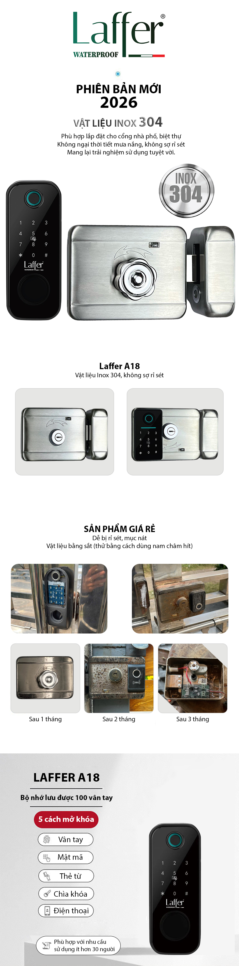 Laffer A18 được chế tạo từ inox 304, một vật liệu không chỉ nổi tiếng với độ bền cao mà còn với khả năng chống rỉ sét vượt trội. Trong khi các sản phẩm giá rẻ thường sử dụng kim loại kém chất lượng, dễ bị rỉ sét và ăn mòn khi tiếp xúc với mưa hoặc độ ẩm, inox 304 của A18 đảm bảo rằng khóa cổng của bạn luôn duy trì được vẻ đẹp sáng bóng và hoạt động ổn định, bất chấp điều kiện thời tiết khắc nghiệt. Đầu tư vào Laffer A18 nghĩa là bạn đang lựa chọn sự bền bỉ và chất lượng vượt trội mà không phải lo lắng về việc thay thế hoặc bảo trì thường xuyên.
