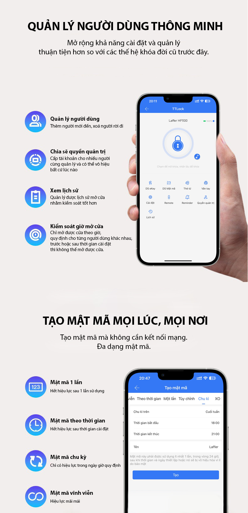 Laffer HF500 cho phép cài đặt vân tay, thẻ từ, và mật mã theo tên gọi cụ thể, giống như danh bạ điện thoại. Tính năng này giúp chủ nhà dễ dàng cấp hoặc xóa quyền truy cập cho người thuê, đồng thời có thể thiết lập mật mã dùng một lần thông qua công nghệ OTP, đảm bảo an toàn tối đa ngay cả khi không có kết nối mạng internet.